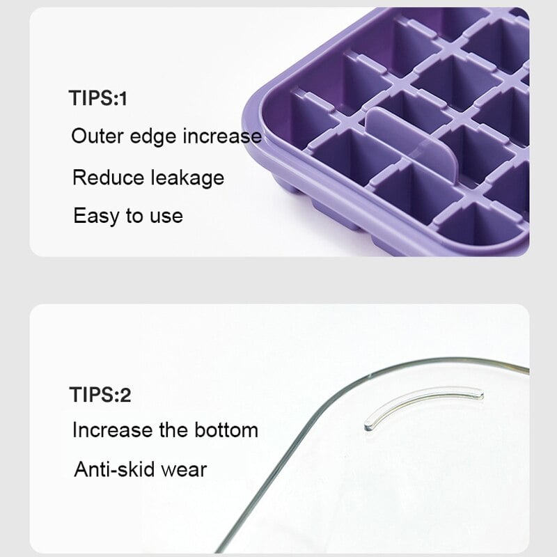 🥤[Sealing & Anti-Odor]This ice cube tray with lid adopts airtight lid design, and is designed with a waterproof platform to tightly cover the ice tray, the lid is perfectly sealed to prevent overflow, prevent ice cubes from sticking and producing odor .