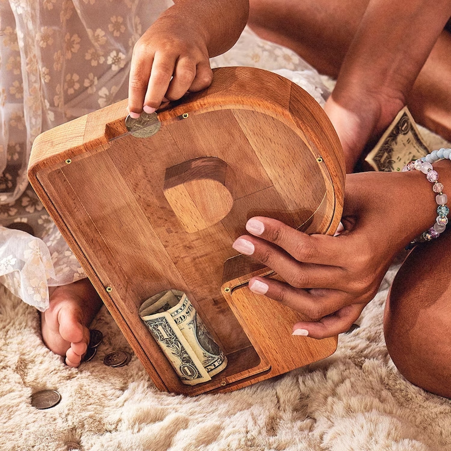 The main structure of the piggy bank is made of natural wood. Each piece of wood used is carefully selected by us. We select wood with good quality and natural and charming texture for processing. After repeated grinding and polishing. The surface of the can is smooth and smooth to the touch.